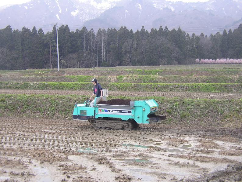 いま散布しているのはレインボープラン堆肥で、これが終わればすぐに自然養鶏の醗酵鶏糞の散布に入る。二種類の堆肥散布と化学肥料に農薬を極力省くのが我が家のこだわりだ。その後に耕耘、代掻き、田植えと続き、終わるころには6月になっている。さてと・・、厚着をして田んぼに出よう。ヒッと手鼻をかむ。ああ忙しい。