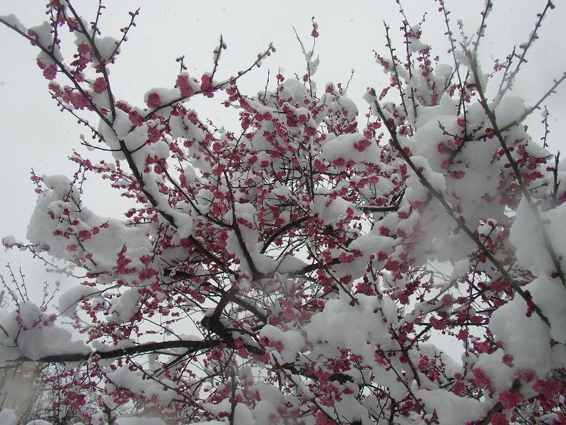 写真は昨年の4月、梅の花が咲いた後に降った雪です。