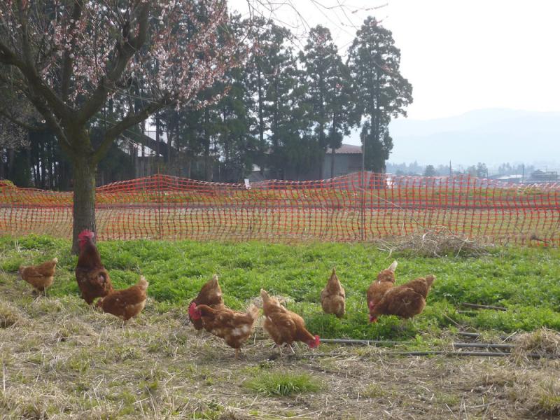 いいねぇ。お日様と緑とニワトリたちと・・。