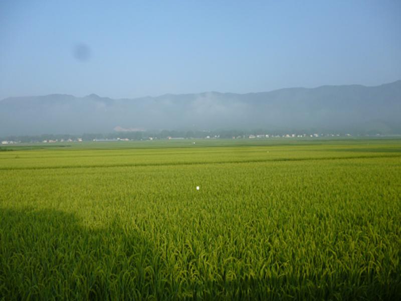 朝日のなか、水田とわが村と朝日連峰がきれいに映えていた。