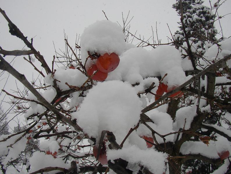 雪をかぶった柿の実がぶら下がっている。