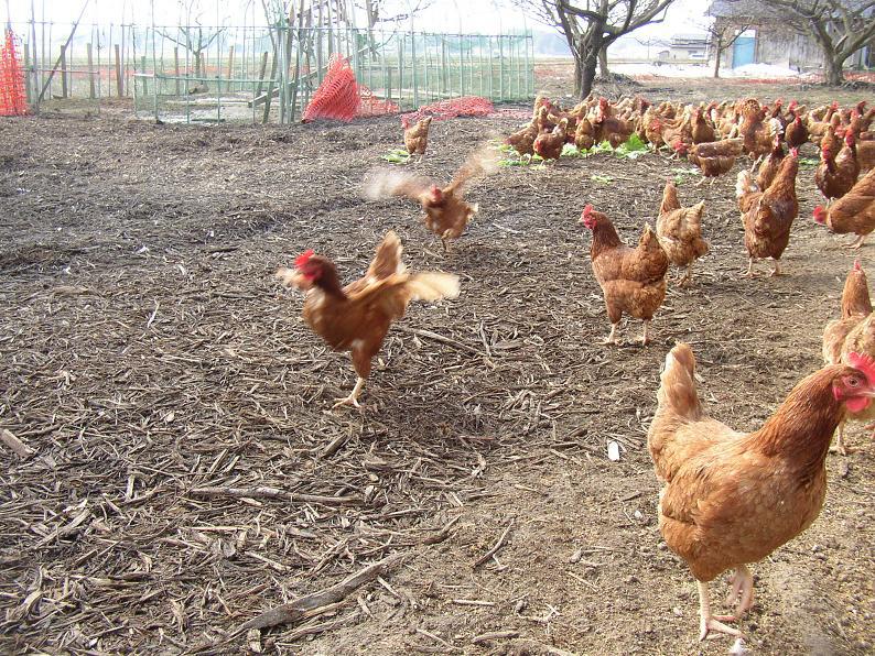 以前、エサとして買い求めていたアメリカ産トウモロコシに、遺伝子を組み換えたものが混ざりそうだということで、使用を中止したことがあった。代用品は「くず米」。しかし、全く予想外の所から別の問題が起こった。日を追うごとに玉子の黄身の色がうすくなっていくのだ。「たまご焼きにしても黄色いものができないよ。」「弁当のおかずがおいしそうに見えない」