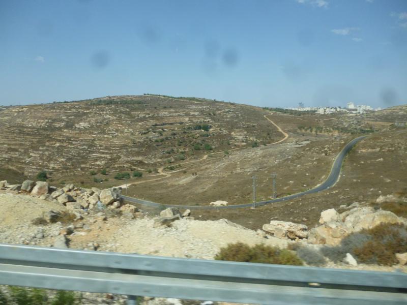 風景は丘のような山並みが続く。その山には自然の木や草が極端に少ない。見える木々は植えられたオリーブの木。地肌がむき出しになっている。その土も我々が思う土ではなく、植物の生育環境に適しているとはとても思えない、風化した岩石のような「土」だ。そのような光景が山から里まで続いている。乾期だとは言うが、見慣れた日本の緑の山々からすれば、まったく異質な光景が続く。これがパレスチナか。