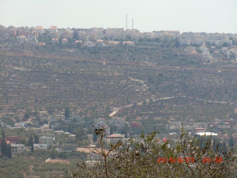 ジャマインの村に入って、周囲を見たら、1kmほど離れた小高い丘の上(水源地)にユダヤ人入植者の村が見えた。下がパレスチナ人の村。