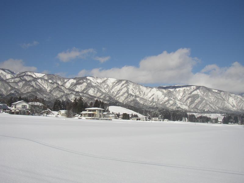 (下は朝日連峰と俺たちの村。右の雪原は村の前に広がる水田)