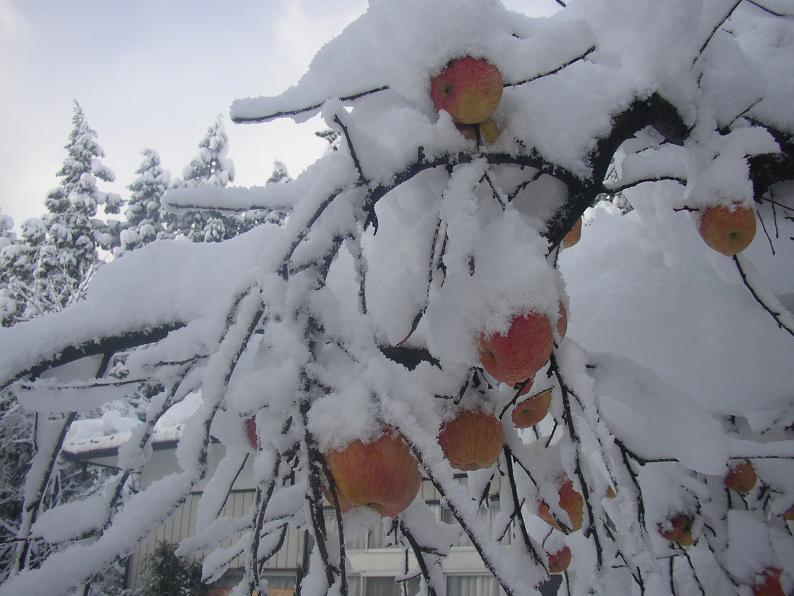 雪にあてたほうが・・といえば、リンゴなどの果物も一緒だ。我が家の庭先のリンゴも雪をかぶったままぶら下がっている。これは仕事の遅れとは関係なく、あくまで風味、美味さをねらってのことで意図的だ。