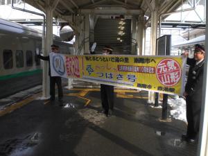 赤湯駅からは赤湯温泉の女将さんが乗り込み、駅長さん駅員さんがお出迎えです。車内はからはたくさんのお客様のいい笑顔が見えました(^^)2月27日(土)も運行しますよ〜♪
