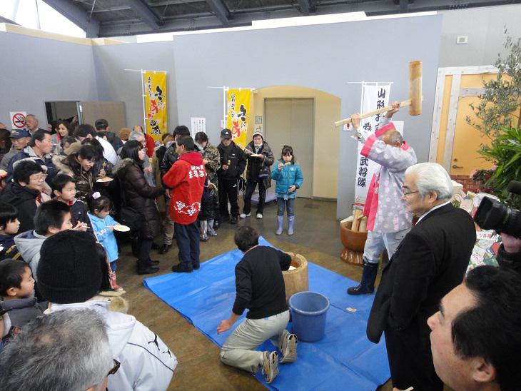 セレモニーの後は、南陽産ワインや地酒、つきたての餅が振る舞われました。大勢の方が美味しい餅ができるのを待っています(^^)