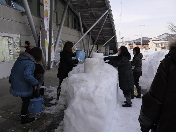 当日は、赤湯駅前商店会、南陽高校インターアクトクラブ、商工観光ブランド課の皆さんにお手伝いをいただき、ろうそくを灯すミニかまくらを作りました。