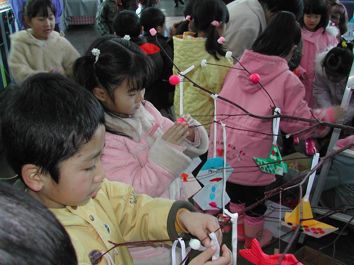 みんな楽しそうに、お友達と相談したりしながら飾っていきます。どんな「だんごの木」ができるか楽しみです♪