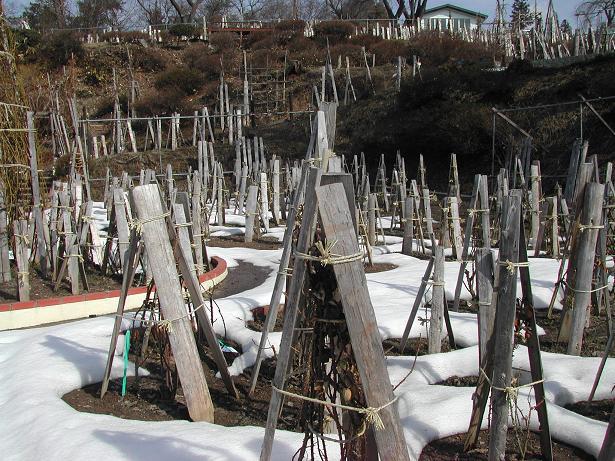 双松バラ園内には約3000株のバラが植えられていますが、すべてに雪囲いをします。一面に広がる雪囲いを見て、改めて大変な作業だと実感させられました。管理人の皆さん、ご苦労さまです。
