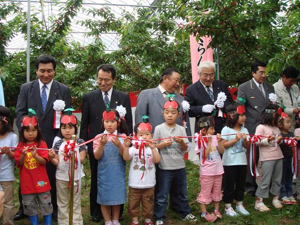 開園式は漆山保育園の園児の皆さんも参加して、賑やかに行われました。お揃いの”さくらんぼ”がとっても可愛いですね♪テープカットの後は、お遊戯も披露してくれましたよ(^^)