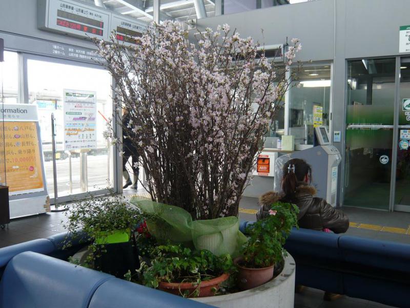 もうしばらく先の春を感じていただこうと、赤湯駅には”冬に咲く桜の花”「啓翁桜」が飾られています。