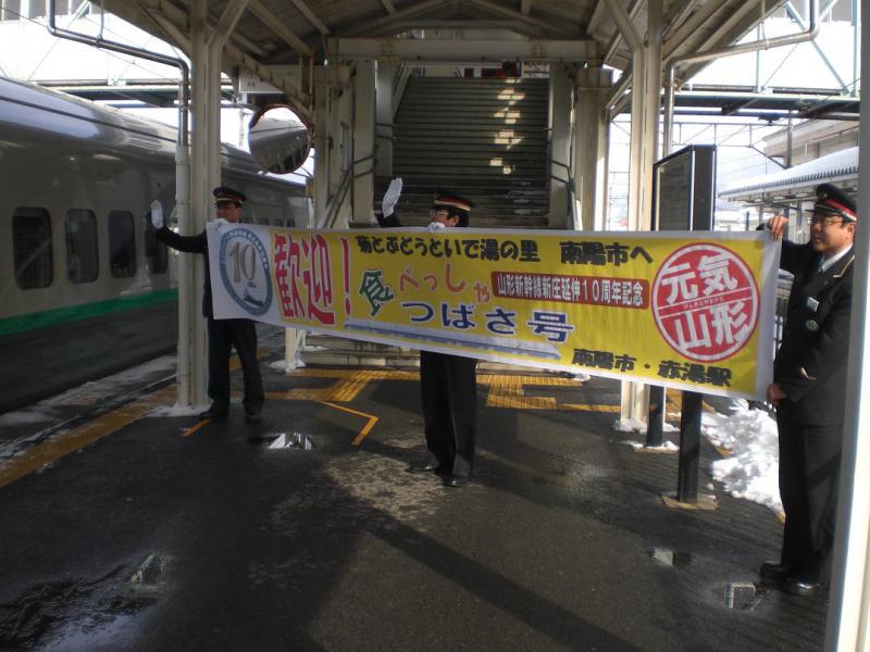 23日(土)に”山形新幹線新庄延伸10周年記念”として「食べっしゃ つばさ号」が運行しました。仙台を出発し郡山で折り返し、新庄へ向かうという今までに無い”Y字運行”、しかも各駅ごとに様々な特産品が楽しめるという特典付です!