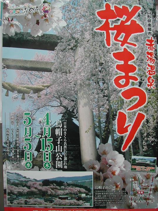 4月15日から開幕する「赤湯温泉桜まつり」のポスターが完成しました!”日本のさくら名所100選の地”「烏帽子山公園」のシンボルでもある鳥居の桜が見事です。