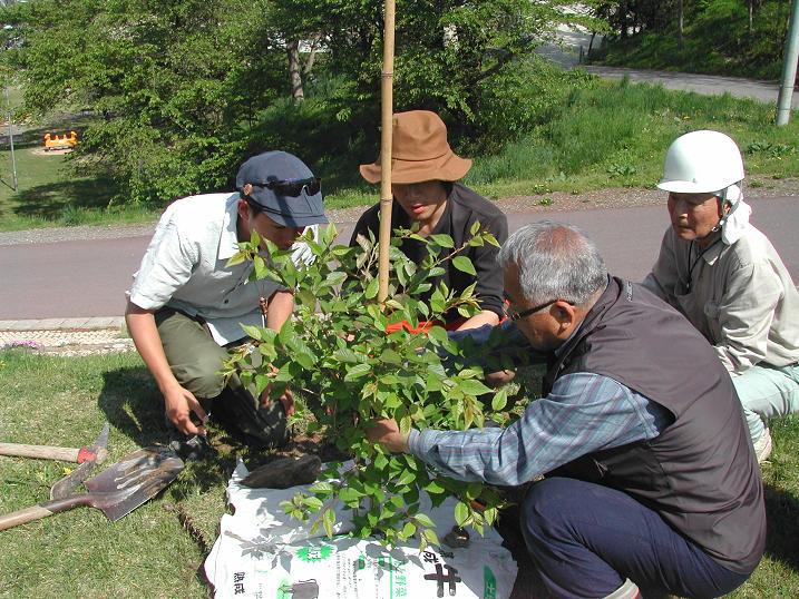 保存会の皆さんにも協力していただき、烏帽子山公園内に3本の桜が植えられました。偶然その場にいらしたお客様も植樹に参加されました(^^)