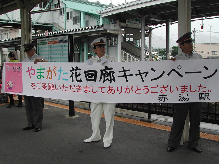 最終日には赤湯駅長さんをはじめ関係者一同で、感謝の気持ちを込めてお出迎えとお見送りが行われました。