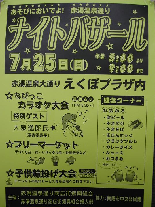7月25日(日)午後5時から、えくぼプラザを会場に”赤湯温泉通り”の「ナイトバザール」が行われます。様々なイベントがあり屋台コーナーも充実しています。ぜひ遊びにお越しください♪