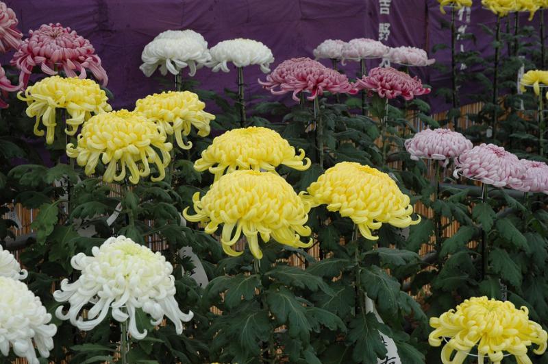 会場内の鉢植え菊は、ほとんどが見頃を迎えています。菊花会の皆さんは、今週末の菊花審査会に合わせて、毎日の手入れに余念がありません。