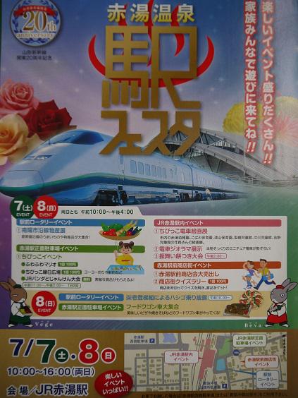 7月7日(土)〜8日(日)に、山形新幹線開業20周年記念イベントとして「”赤湯温泉”駅フェスタ」がJR赤湯駅を会場に開催されます。