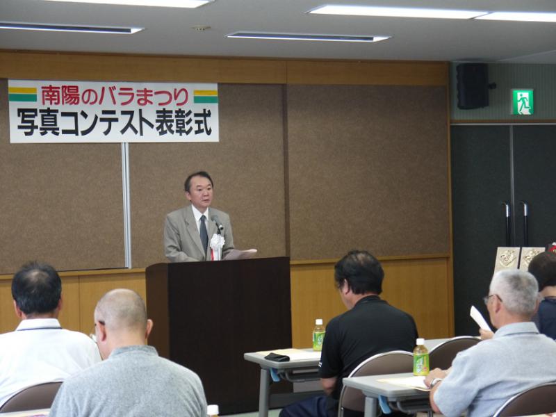 昨日「第13回南陽のバラまつり写真コンテスト」の表彰式が執り行われました。主催者の丸森会長です。
