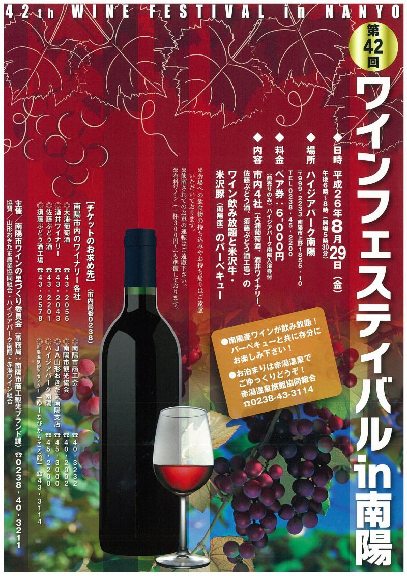 8月29日(金)午後6時より「第42回ワインフェスティバルin南陽」が開催されます。会場はハイジアパーク南陽。市内4社のワインが飲み放題とバーベキューをお楽しみいただけます。枚数に限りがありますので、チケットはお早めにどうぞ。