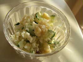 まずはシンプルにタマネギとキュウリのポテトサラダにしてみました。