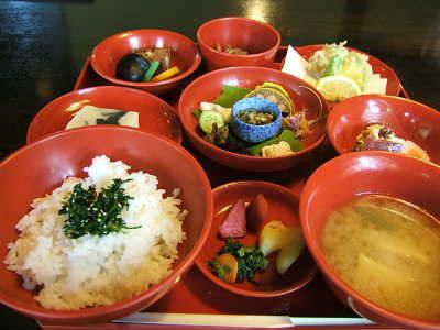 風雅の国で撮影の後、馳走舎で昼食。前日から山形入りしていたディレクターさんが「昨日の夜、芋煮っていうのを食べたんですよ。あれおいしかったなぁ〜。もう1回食べてもいいなぁ」とおっしゃっていたので、芋煮膳を注文したのですが、あいにくの芋煮きれ。ということでこちらのお膳が出てきました。