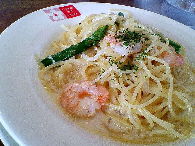 写真はランチのパスタ、エビとアスパラ。もう一品は温野菜のカレーソース。