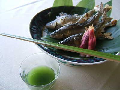 写真は夏限定のメニュー、米でとろみをつけた蓼(タデ)酢でいただく鮎焼き。