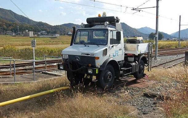 「線路、陸両用」の保線トラックの写真です。
