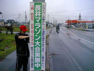 鉄人会など朝から明日のフルマラソン大会の看板立てや