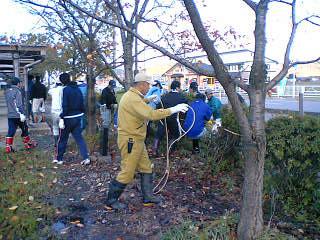 写真は父兄による中学校の雪囲い風景、家ではやったことがないのですが