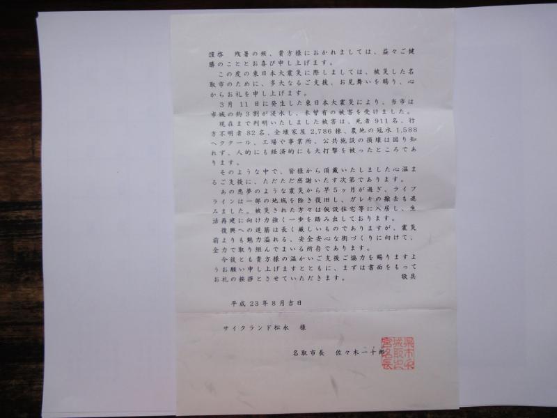 名取市長さんから届いた、ありがたい御礼状。