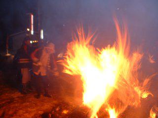ハッピをはおり 燃えやすいようにかき混ぜたりする。