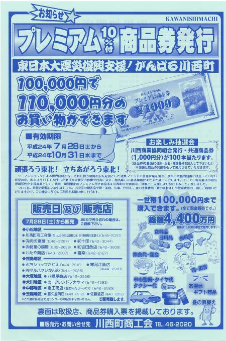 100,000円で110,000円のお買い物ができる商品券を発売いたします。まtお楽しみ抽選会で川西商業組合発行の共通商品券が100本当たります。