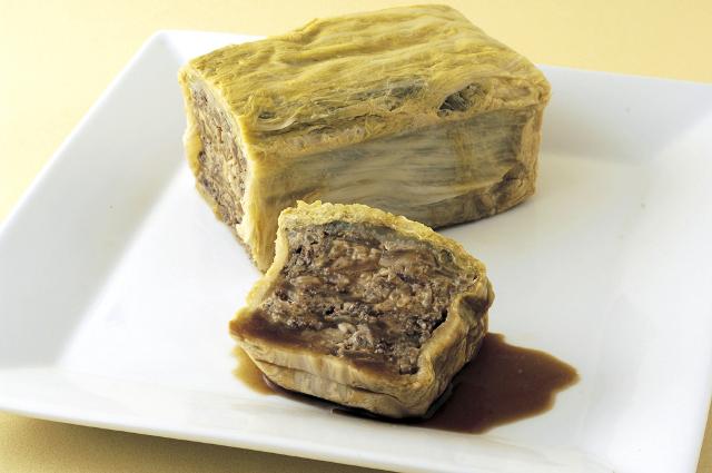 すき焼きを型に入れて、白菜で包み、蒸し上げた商品です。野菜と肉が層になっている様を「ミルフィーユ」に見立てました。