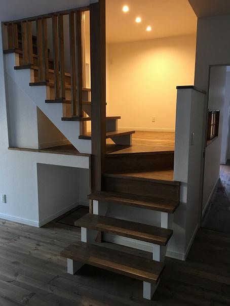 階段の途中から空間へいくレイアウトで、スキップフロアのようなデザインと