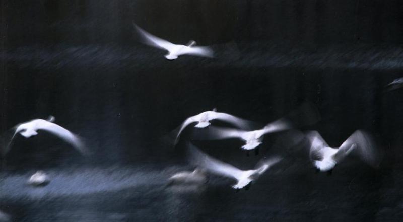 ▼白鳥ファミリー 早朝餌を探しに飛揚 スローシャッター撮影