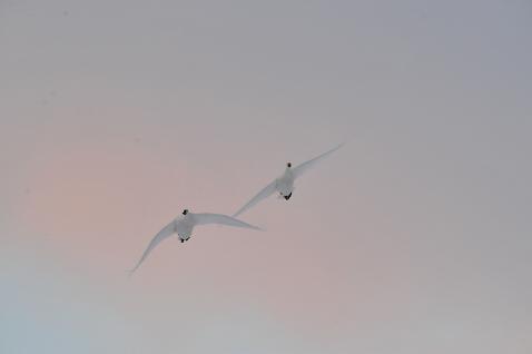 夕暮れ時、夕日に照らされ白鳥の群れがパラパラと帰る。
