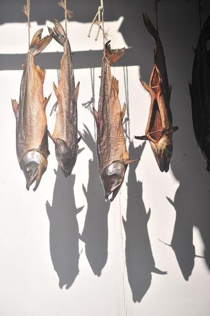 お帰り鮭さん。稚魚が成長し、長い旅行から子孫を残すため様々な危険から守られて戻って来た鮭。人間の冬の貴重な食料となる。