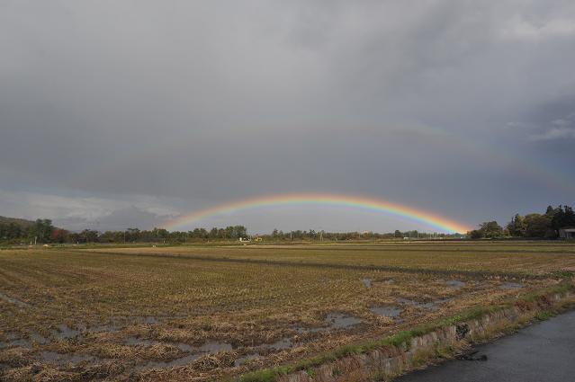 先日昼食をすませ、畑に向う途中で低い虹のアーチに遭遇した。今までに見たことが無い低い虹。広角レンズを装着して急いでシャッターをきる。(米沢市内)