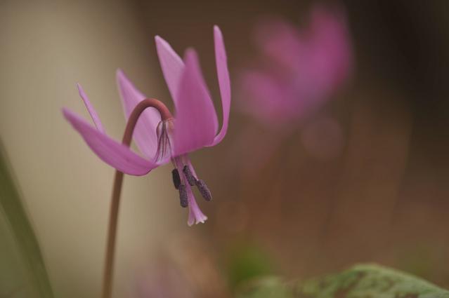 わが家の庭に、一番先に春を告げてくれるのが「カタクリの紅紫色の花」。白色の花は一週間くらい遅れて咲く、めったに見られない白色の花色。次回には紹介できるかな。多年草で毎年綺麗な花が咲き春を告げてくれる春の使者。しかも、少しずつ株が増えている。こぼれた種が芽を出してくれるのだろう。種子から発芽して、咲き始めるまで、7年から10年の歳月を要する貴重な花。