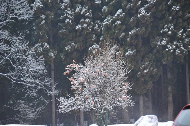 熟した柿。綿帽子をかぶっている。それに木々が、大寒特有の光を放ってる様は、米沢の風物詩。「枯れ木に花を咲かせましょう」といって咲かせたような芸術作品。奥に杉の木の大木も薄化粧をしている。やがて太陽が顔を出す頃には、この美しさは消えてしまうはかない命。でも、懸命に生きている姿に感動を覚える。