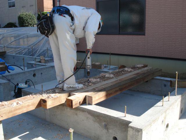 建方に先立ち土台の設置をしています。