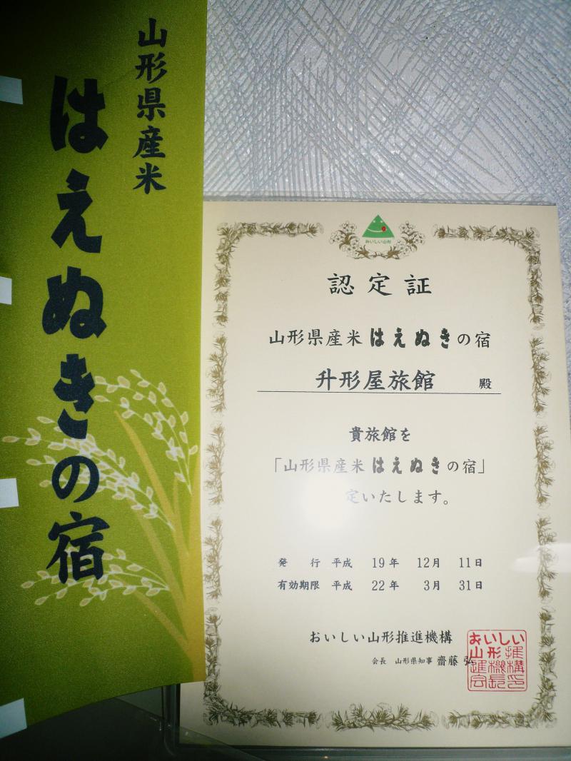 「山形県産米はえぬきの宿」に認定いたします。との事で、本日認定書が届きました。
