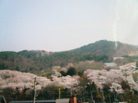 当館の「南天の間」と「梅の間」から見える烏帽子山の桜です。