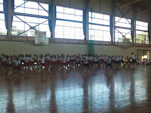 各組が応援を披露し合います。振り付けでの足音とともに大きな声で歌う応援歌が、朝の体育館に響きわたります。