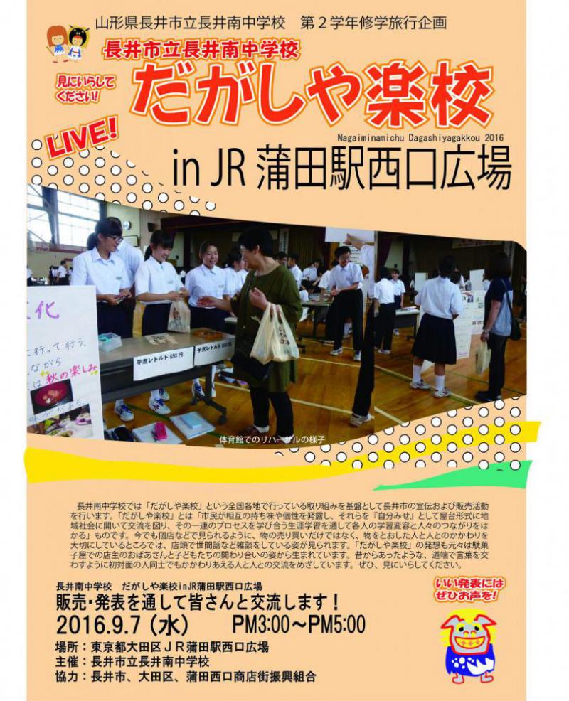 修学旅行1日目、9/7午後3時から午後5時に蒲田駅西口広場にてだがしや楽校inJR蒲田西口広場という名称で長井市の宣伝と商品の販売を行います。午後2:45頃におらんだラジオでの放送も予定しています。