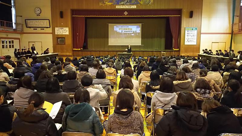 1/25入学予定の小学生、保護者のみなさんを招いて中学校の説明会が行われました。新生徒会企画会メンバーから学校生活の紹介をスライドとVTRで紹介しました。